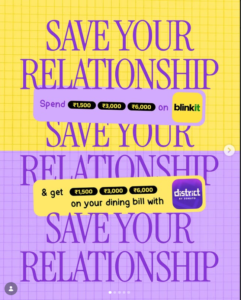 The Blinkit graphic uses a repetitive, high-contrast mantra—”SAVE YOUR RELATIONSHIP”—to frame quick-commerce spending as a tactical necessity. By layering tiered spending goals (₹1,500 to ₹6,000) over a yellow grid background, it creates a “math-of-love” logic. The creative core is an ecosystem play, shopping on Blinkit unlocks equivalent vouchers for the District by Zomato app, positioning the act of buying gifts as the strategic “investment” that funds the actual Valentine’s date.
