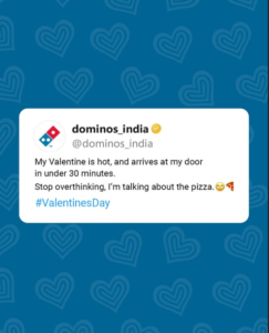 This image is a playful Valentine’s Day promotion from the Domino’s India social media account. Set against a blue background patterned with hand-drawn hearts, the post features a white card with a “bait-and-switch” joke: it describes a “hot” Valentine that arrives in under 30 minutes, only to reveal—with a touch of wit—that it’s referring to a pizza. By subverting romantic tropes to highlight their signature delivery speed, the ad uses a cheeky, relatable tone to engage customers during the holiday.