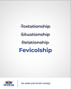 This minimalist Fevicol ad humorously critiques the fragility of modern romance by striking through terms like “Situationship” and “Relationship” in favor of a bold “Fevicolship.” By subverting dating lingo, the brand positions its adhesive as the ultimate symbol of a permanent, unbreakable bond. The inclusion of the Hindi tagline, “Ab sabki jodi lambi chalegi” (Now everyone’s bond will last long), reinforces Fevicol’s long-standing reputation for literal and metaphorical strength.