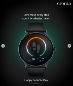 Croma is renowned for their appealing social media graphics with dark palettes. On Republic Day 2026, they chose to promote their wearable tech in a nationalist way. The graphic presented a smart watch with tricolour in it urged viewers to ‘Let’s make every step count for a better nation.