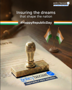 PolicyBazaar celebrated Republic Day 2026 with a sophisticated post that links the solemnity of national governance to the security of the Indian family. The visual centers on a high-resolution image of a legal document being authenticated with a formal PolicyBazaar stamp, set against a warm, professional backdrop that includes the Indian tricolour flag.